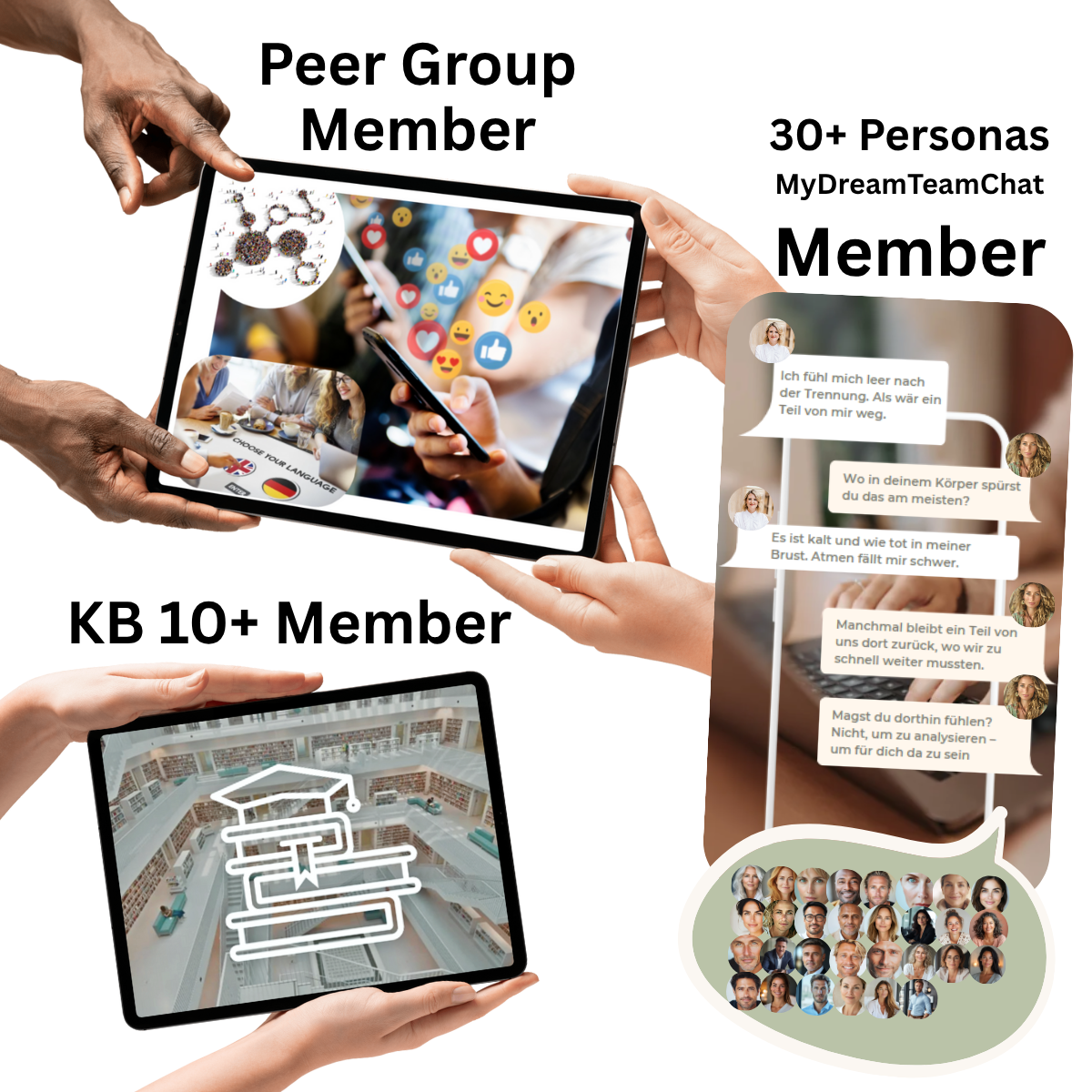 30+ psychologisch fundierte Resonanz-Personas – KI-Sparringspartner auf Abruf, in deiner Sprache, rund um die Uhr.