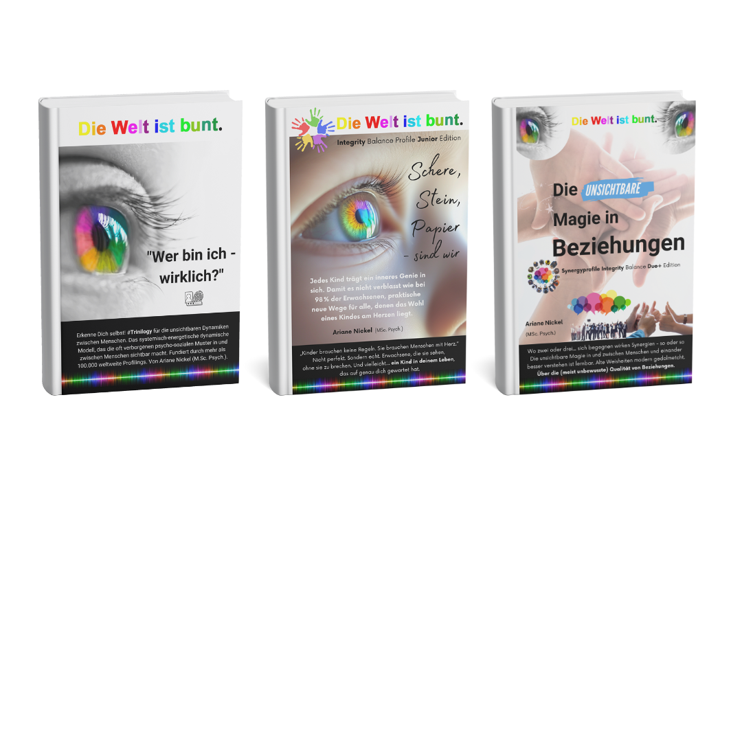 Selfimageprofile + Synergyprofile basieren auf 'Die Welt ist bunt. TRINILOGY Colorology - Ein systemisch-energetisches dynamisches Erklärungsmodell meist unbewusster psycho-sozialer Muster in und zwischen Menschen.' Erkenntnisse aus über 100.000 Profilings weltweit - Gobale Langzeit-Studienreihe unter der Leitung von Ariane Nickel (MSc. Psych.)